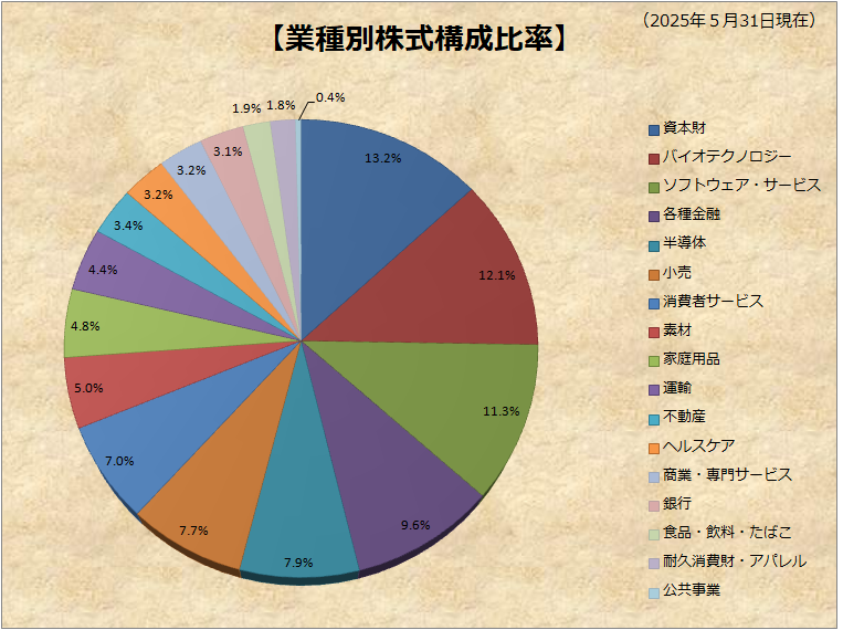 株式の業種別の構成比率は、資本財セクターが突出していますが、資本財が大好物なのでついつい偏りがちです。株式選定時に多少参考にしてなるべく分散を心掛けています。