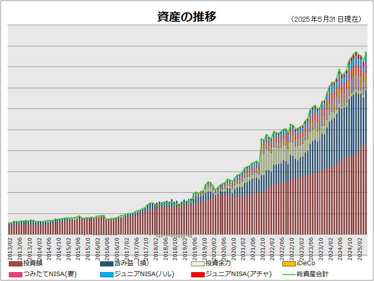 2019年6月より、これまで私財の中からこっそり積み立ててきた妻名義のつみたてNISAと子ども名義のジュニアNISAも合計金額のみ反映することにしました。これは資産管理の一元化と、定期的な資産移転(贈与)をしやすくするためです。