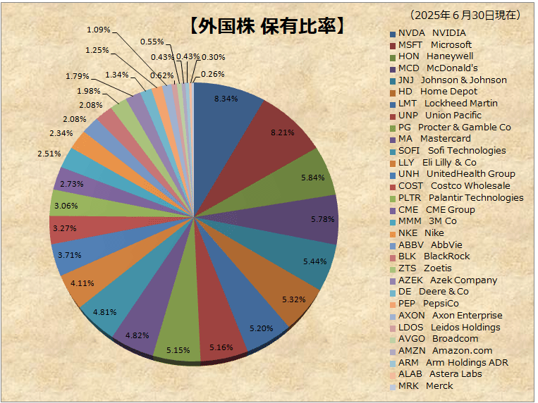 6月の総資産額は、前月比で+4.62%と続伸。今年1月に記録した過去最高値を更新し、高値から+4.39%。こうして見るとトランプ関税による暴落が良い買い場だったことが良くわかります。鼻をつまんでコツコツ買っていた人が報われましたね。