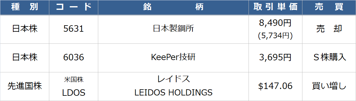今月売却した銘柄は日本製鋼所(5631)の1銘柄です。米国によるイランの攻撃で一気に緊張が高まり、株価が急騰しました。個人的には馴染みのある銘柄ですが、短期的には上がり過ぎと判断し売却しました。