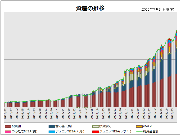 とは言え、今はインフレ環境下、現金のままで保有するリスクも考えると、株か金(ゴールド)のどちらかに投資すべきとも思いながら、さてどうしたものかと頭を悩ませる今日この頃。そんなわけで2025年7月の資産運用状況を振り返ります。今回もどうかお付き合いください。