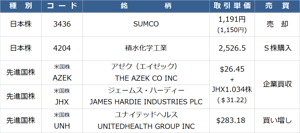 エイゼック(AZEK)がジェームス・ハーディー(JHX)に現金と株式交換で買収されましたので、新たにJHXがポートフォリオに加わりました。売却しても良かったのですが、AZEKはなくなるわけではなく、JHXのグループに残りますから、すぐに売却せずにしばらく保有しようかと。