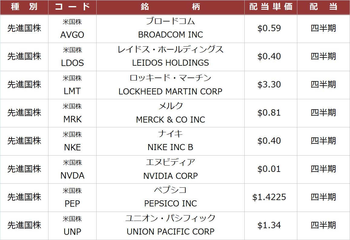 配当金は、米国株8銘柄から受領しました。前年同月比で98%となり、今年に入り初めての前年割れとなりました。これは単に配当金の月ズレの影響です。