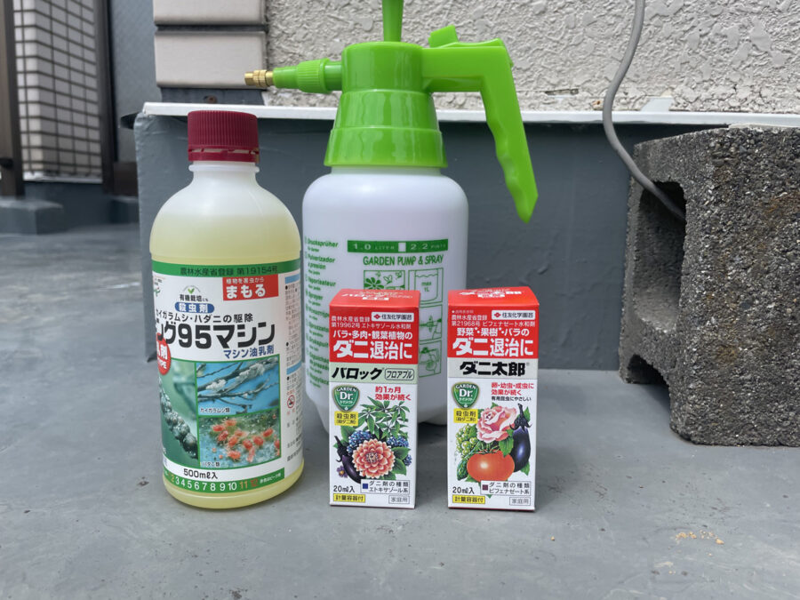 さて、ダニ問題。これはサビダニだけでなく、前述のとおり葉にはハダニの被害も以前からあり、これまで葉に散水したりして対応してきましたが、勉強も兼ねてこの機会に一旦リセットしようと思い、農薬を購入しました。