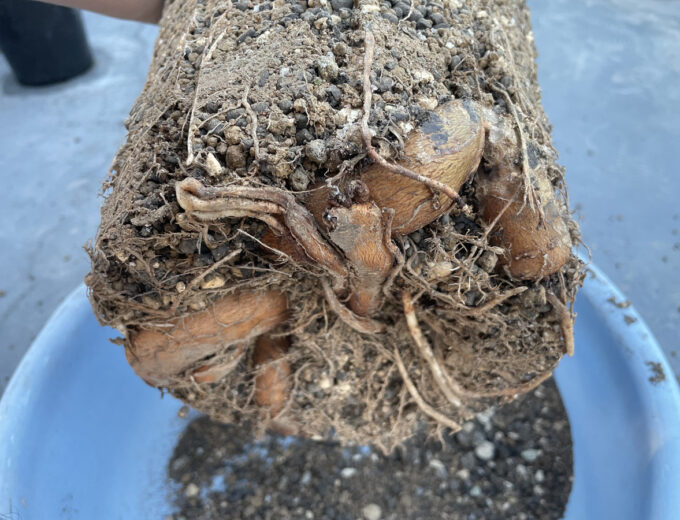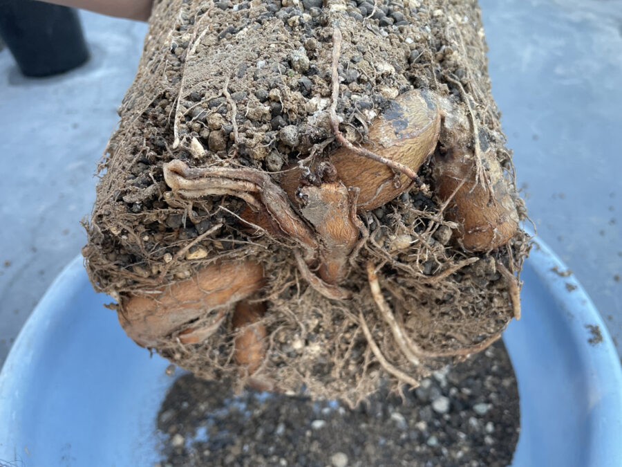 一気に3号もサイズをアップすると株の下にも土が結構入ります。つまり今後更に塊根が成長するスペースも十分に確保されてたことになります。抜いた株は簡単に落ちる土だけ落として、作っておいた培養土を入れていきます。