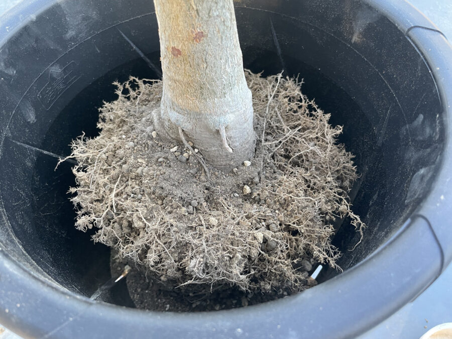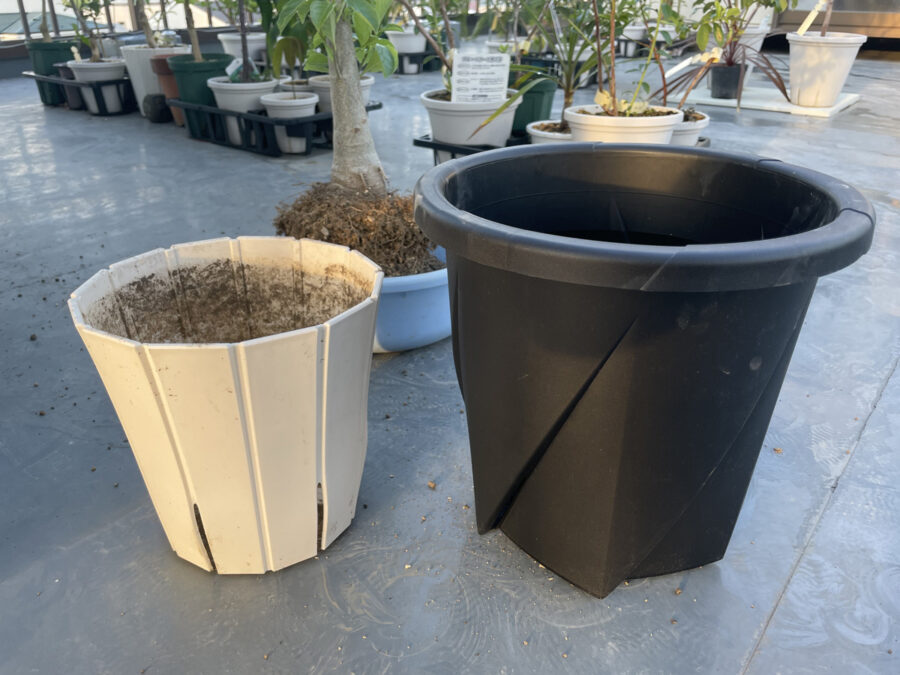 鉢のサイズを7号から一気に10号に鉢増しすることにしたためです。(用意したのは、大和プラスチックの根はりポット30型。根を育てたいのでやはりスリット鉢は欠かせません。)