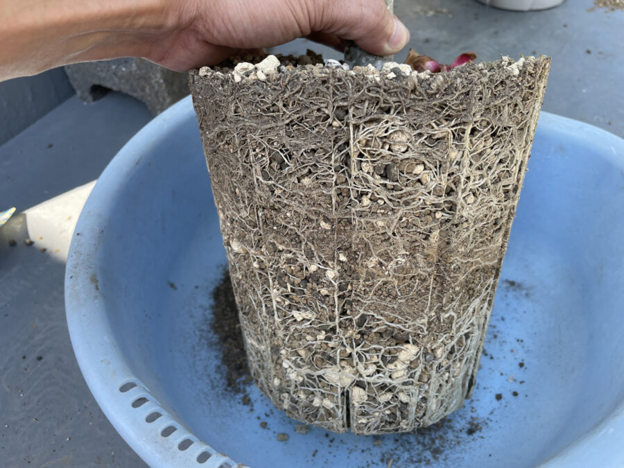 そんなわけで意を決して鉢を抜いてみるとびっしりと根が回っています。毎日鉢底から水が流れ出るまでしっかり潅水しても全部飲んでしまうのもうなづけます。