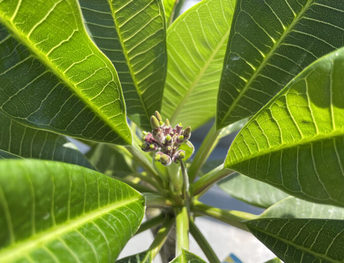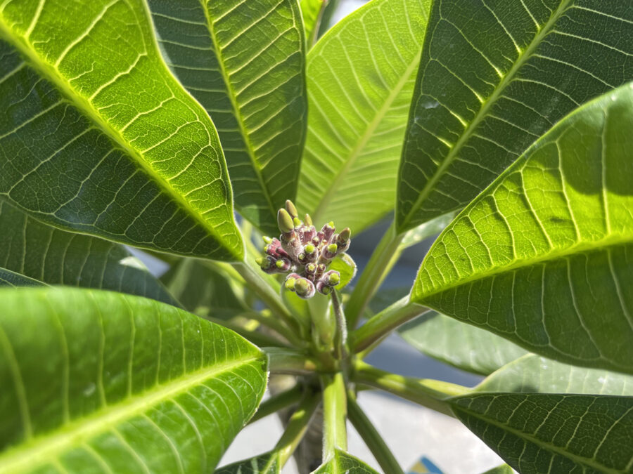 今度は反対側の枝から花芽が出てきていました。今シーズンはすっかり楽しんだと満足していましたが、この子にとってはまだ折り返しのようです。やっぱりプルメリア、大好きです!