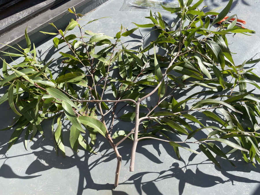 一方葉を残した方は1週間経ってもほとんど動きがなかったため、「それならば・・・!」と一部枝葉を残した2本のユーカリもすべて丸坊主にしました。果たしてこちらも芽を吹いてくれるのでしょうか・・・。