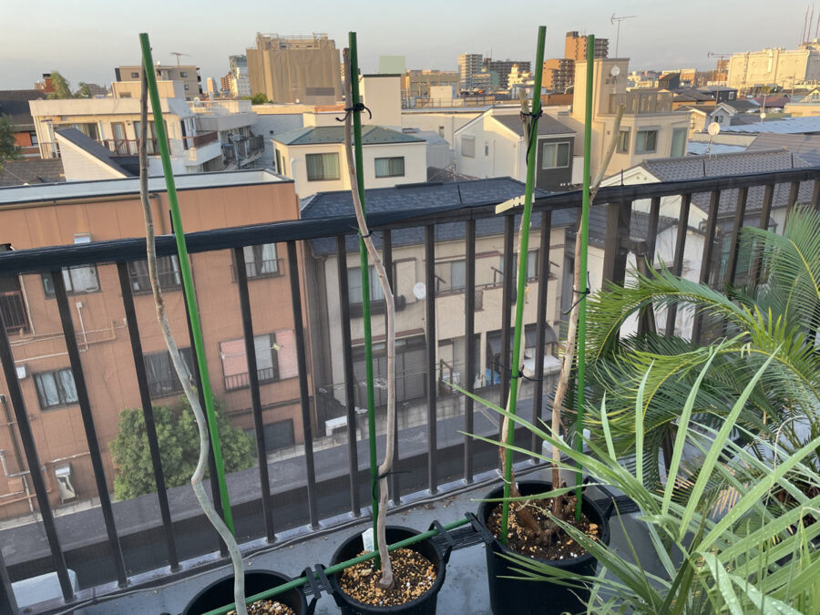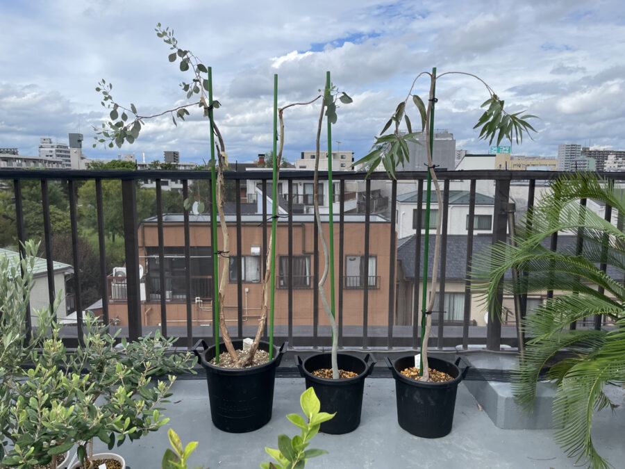 9月の初旬に全てのユーカリを鉢増しし、転倒防止対策を実施しました。具体的には持ち手のあるグロウコンテナに植え替え、持ち手部分に支柱を通してグロウコンテナ同士を連結する処置を施しています。