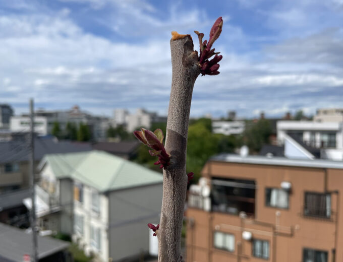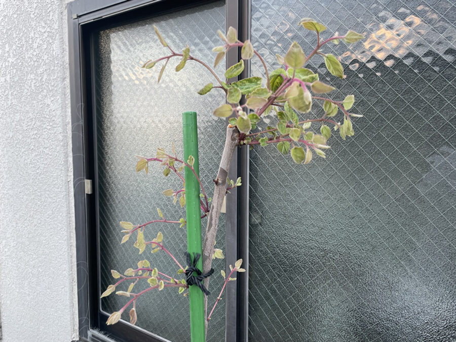 一方のポポラスは、小さい苗木の頃に水切れでいったん枯れたのですが、その後復活。その頃から2本仕立てになっています。丸坊主にした際、1本からしか芽が出なかったらどうしようかと思いましたが、2本の幹からそれぞれ発芽を確認することができ安堵しました。