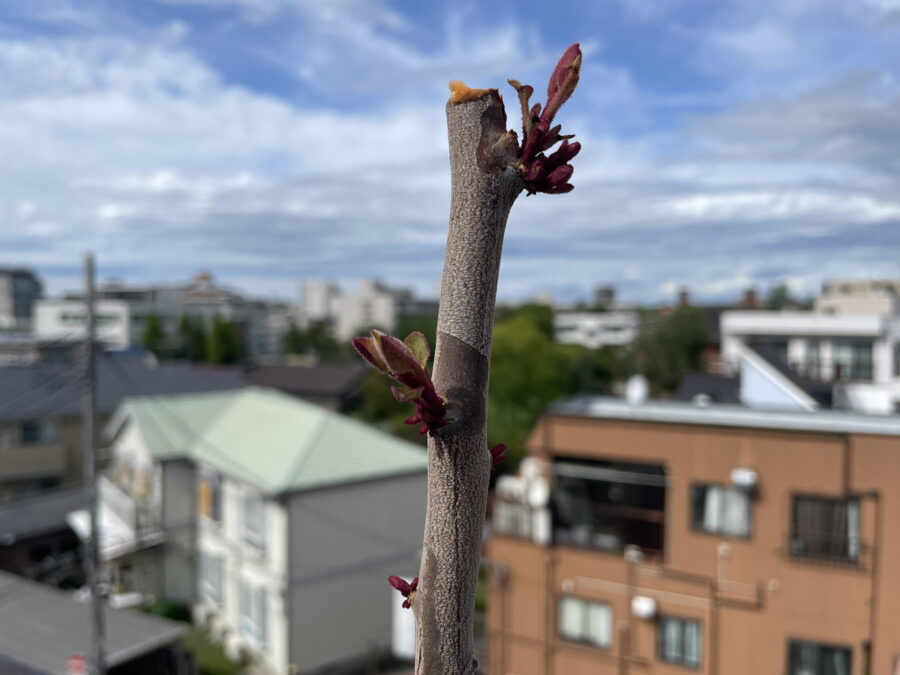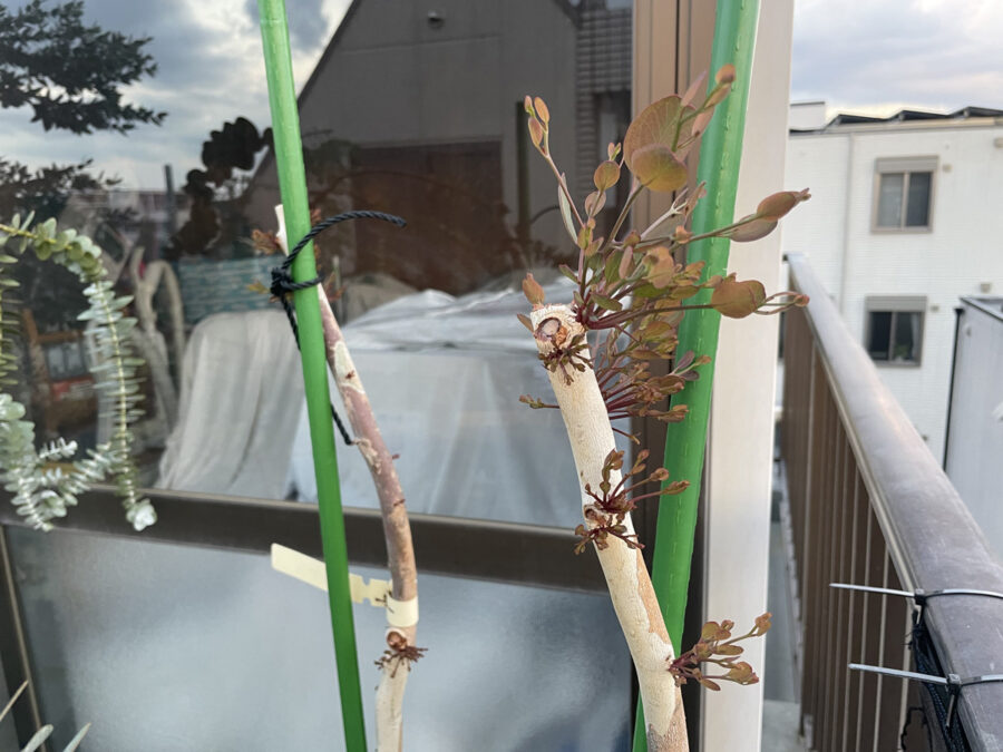 しかし、結果的には丸坊主にしたレモニューカリの方がすぐに反応がありました。レモンユーカリの幹は節もまばらでつるんとしており、芽が出るのか不安でしたが、強剪定をして数日後には赤い点が現れ始めたのです。