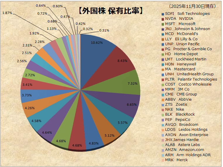 11月の総資産額は、前月比で+0.86%と続伸。微々たる上昇ですが、マイナスにならずに踏み止まった印象です。残り1カ月、2025年を有終の美で飾れるか、期待しつつ師走を駆け抜けたいと思います。