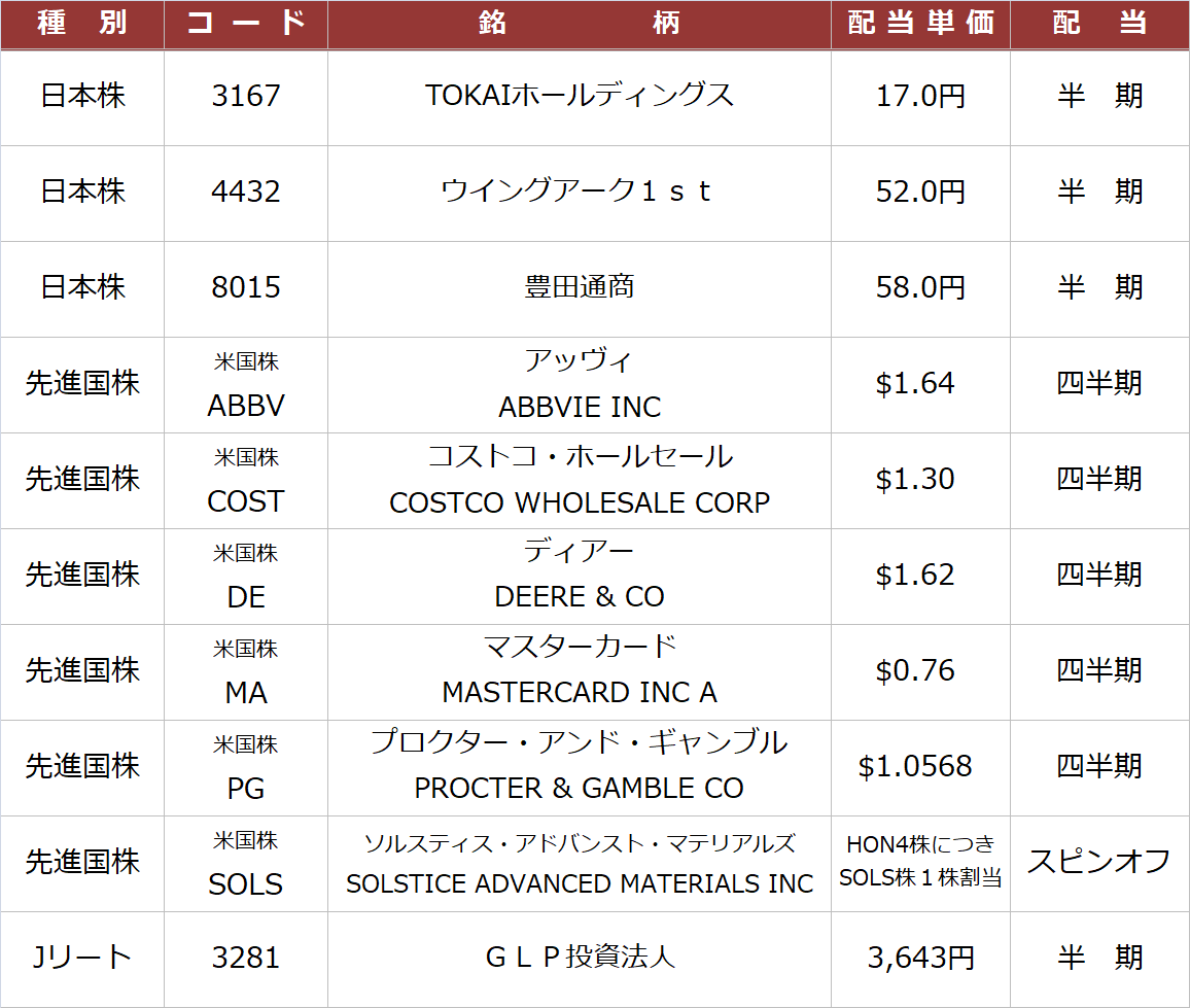 配当金は、日本株3銘柄、米国株5銘柄、J-REIT1銘柄からそれぞれ受領しました。前年同月比で+7%となりました。