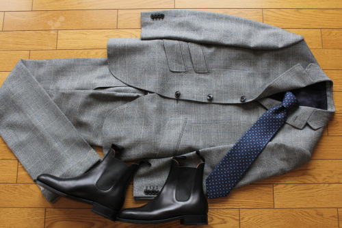 靴はJ.M.Weston(ジェイエムウエストン)の705(チェルシーブーツ)で。