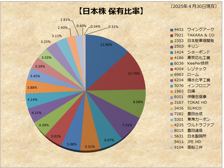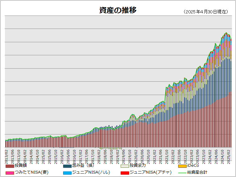 原本保証された金融商品しか信用しない妻を説得することはとうの昔に断念したため、将来のインフレリスクや子どもの教育資金、老後への蓄えの足しになれば・・・、程度のかなり緩い目標を掲げ、趣味もかねて楽しみながら運用中です。