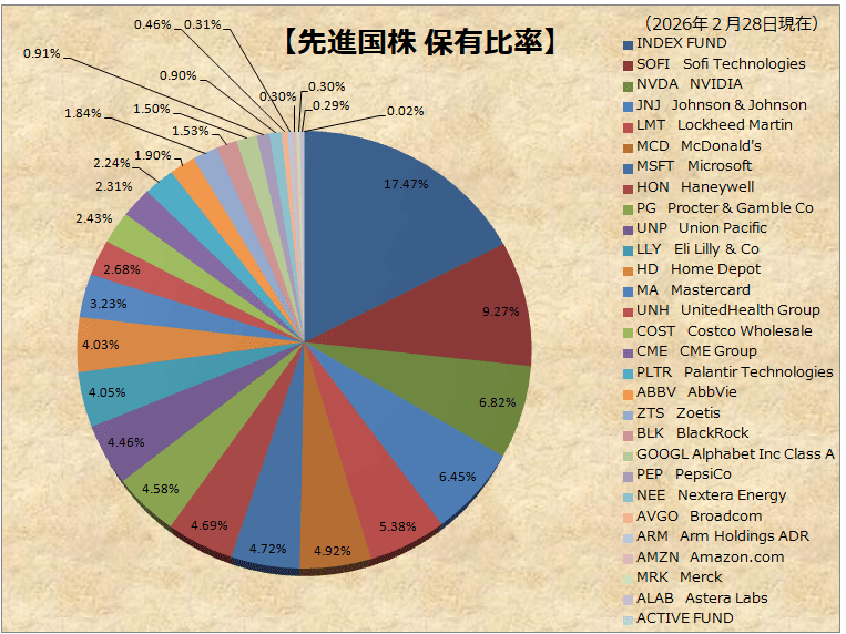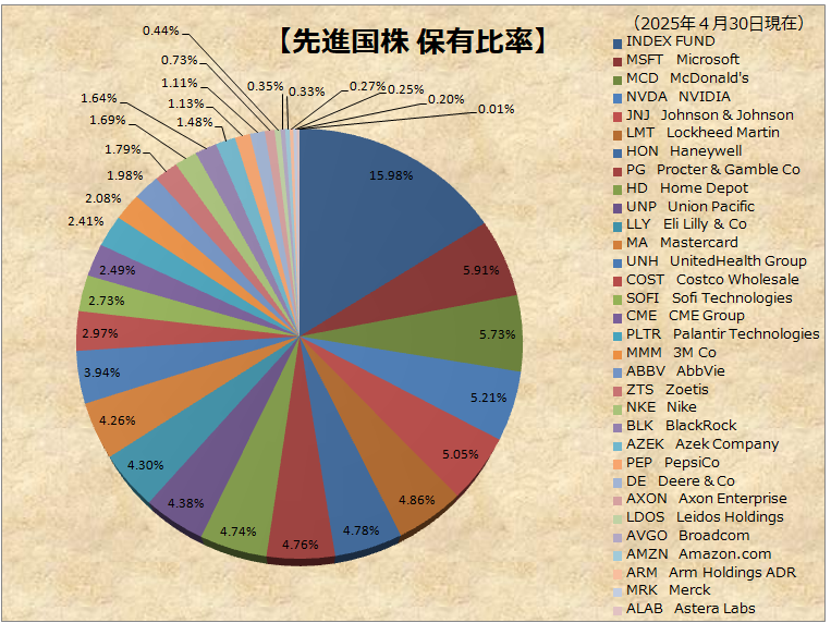 当ポートフォリオは自らが管理する資産(主に証券)を掲載しており、家計や家族の預金口座等は一切含みません。そのため、ポートフォリオ全体のリスクは幾分高めに設定しています。